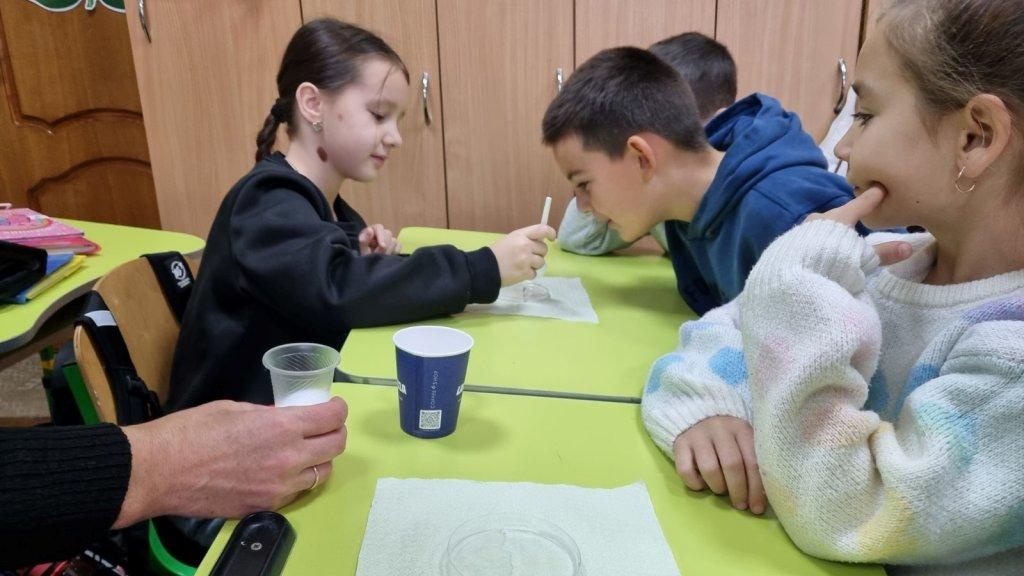 Під час заняття діти досліджували, якою буває вода в різних станах: рідкому, твердому та газоподібному. Вони спостерігали, як вода випаровується, як замерзає та тане, як змінюється її форма залежно від посудини. Особливу зацікавленість викликали досліди з розчиненням речовин у воді.