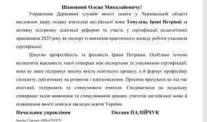 Вчитель англійської мови Новоселицького ліцею №1 Ірина Томулець стала експертом сертифікації педагогів Львівщини та Волині. Це почесна і відповідальна місія, адже сертифікація — це не лише перевірка професійних компетентностей та знань, а й підтримка вчителів у їхньому прагненні до розвитку та вдосконалення.