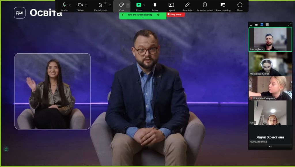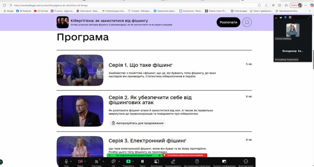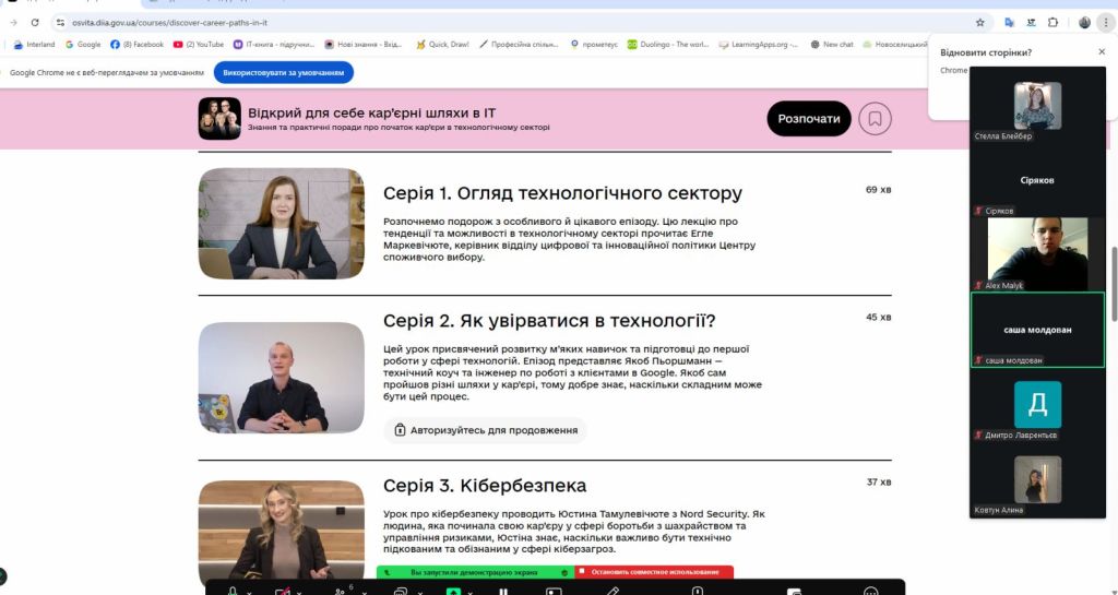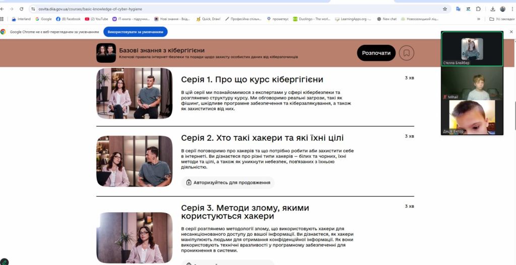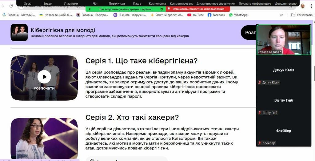 Так, вчителями інформатики Стеллою БЛЕЙБЕР та Антоном ДИСАРЕМ організовано спільний із учнями різних класів перегляд освітніх серіалів на Єдиному державному вебпорталі цифрової освіти «Дія.Освіта», що сприяють вдосконаленню знань, умінь та навичок у питаннях цифрової безпеки, використання популярних комп’ютерних програм, орієнтування в ІТ-професіях тощо.