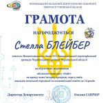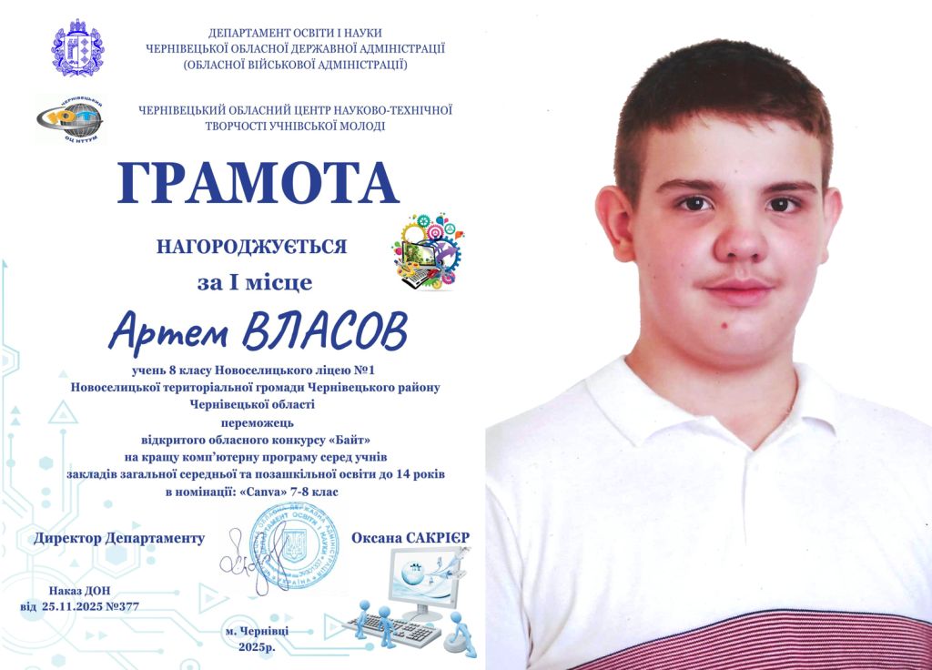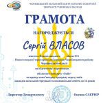 - Дипломом за І місце серед учнів 7-8 класів народжено Артема ВЛАСОВА, учня 8-А класу (керівники Стелла БЛЕЙБЕР та Сергій ВЛАСОВ) – у секції «Canva»;