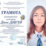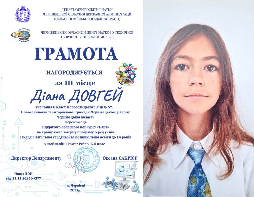 - Дипломом за ІІІ місце серед учнів 5-6 класів народжено Діану ДОВГЕЙ, ученицю 6-Б класу (керівники Стелла БЛЕЙБЕР та Тетяна ДІДУХ-БОЙЧУК) – у секції «PowerPoint».