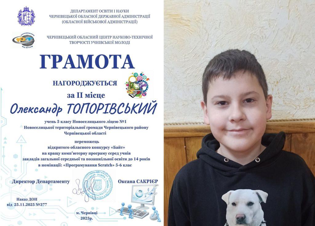 - Дипломом за ІІ місце серед учнів 5-6 класів нагороджено Олександра ТОПОРІВСЬКОГО, учня 5- класу (керівник Антон ДИСАР) – у секції «Програмування Scratch» ;