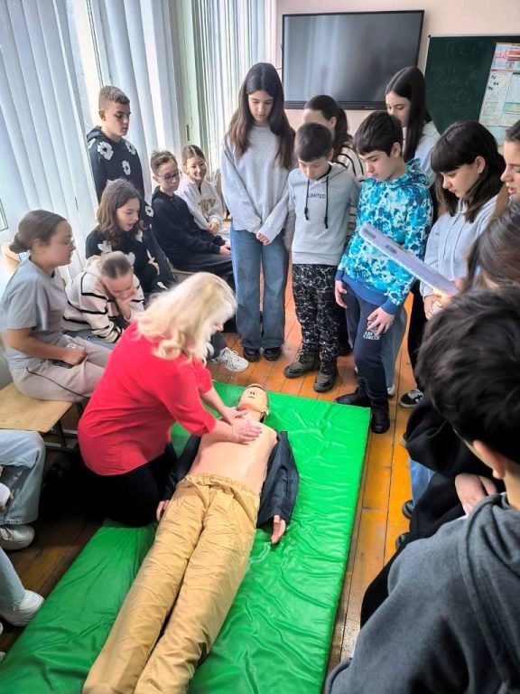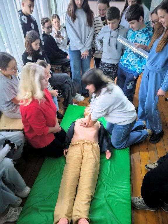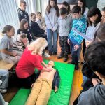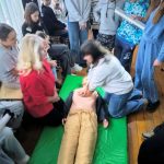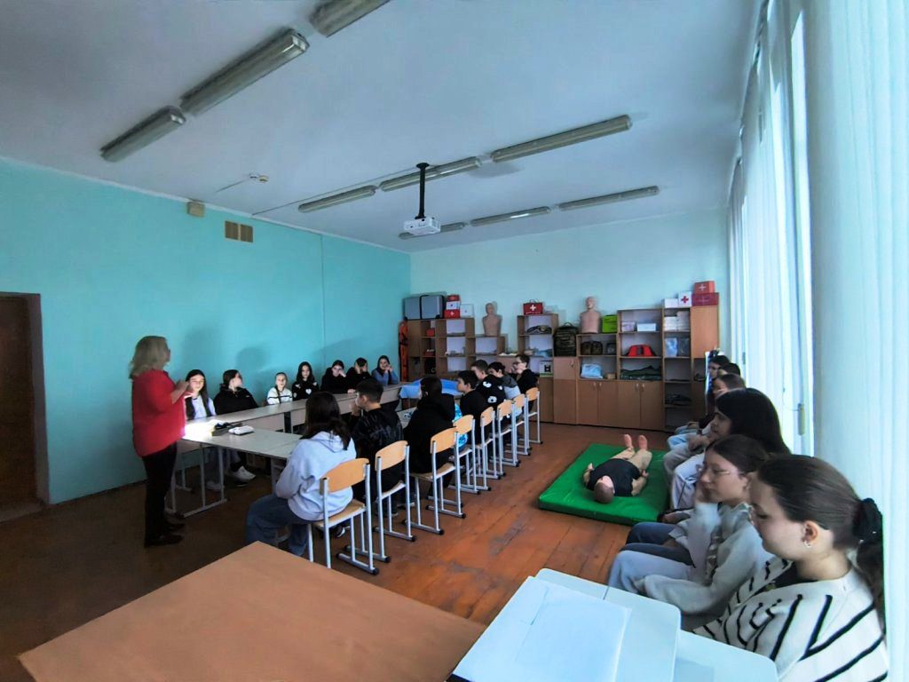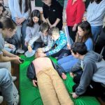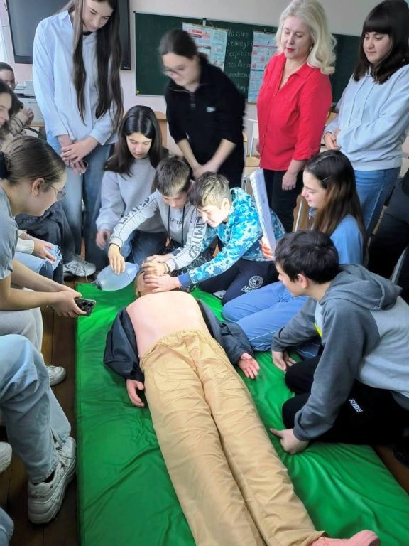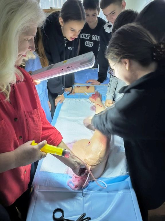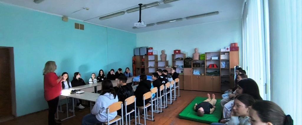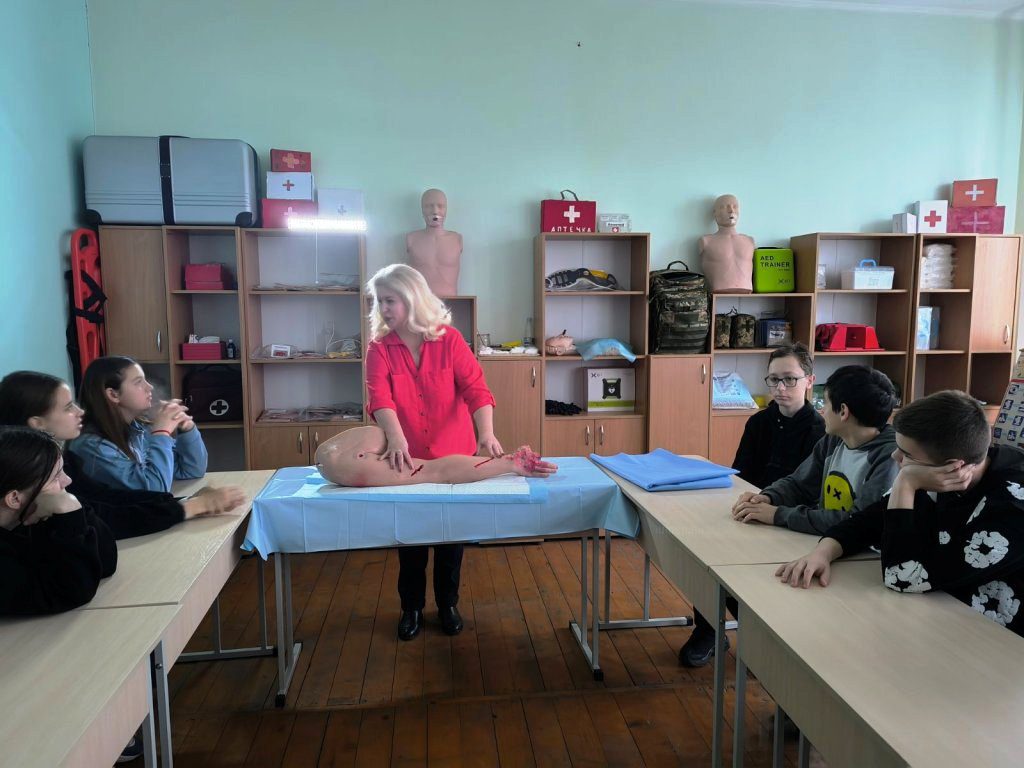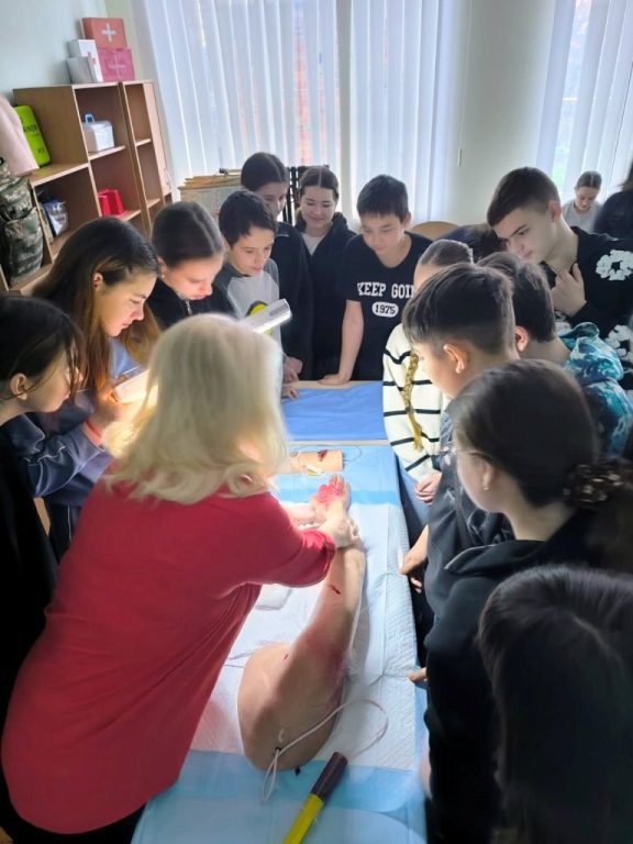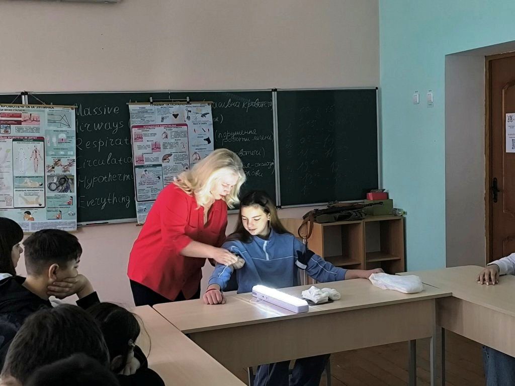 Під час зустрічі семикласники тренувалися надавати першу домедичну допомогу уявному потерпілому, зупиняти різні види кровотеч, накладати різного виду пов’язки тощо.