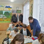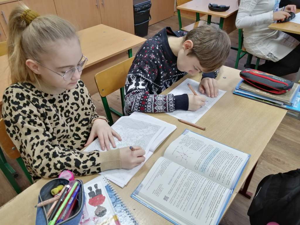 Особливу увагу було приділено географічним об’єктам, згаданим у творі: річці Маккензі, долині Патичків, Гудзоновій затоці та Ведмежому озеру. Працюючи з картою, шестикласники знаходили ці об’єкти, з’ясовували їх розташування та значення, а також встановлювали зв’язок між художнім текстом і реальною географією. Практична частина уроку викликала жвавий інтерес: діти вчилися відтворювати маршрут головного героя на контурній карті, простежуючи його складний шлях через безлюдні простори Канади. Така діяльність сприяла розвитку просторового мислення, навичок роботи з картою та кращому розумінню екстримальної ситуації подій оповідання.