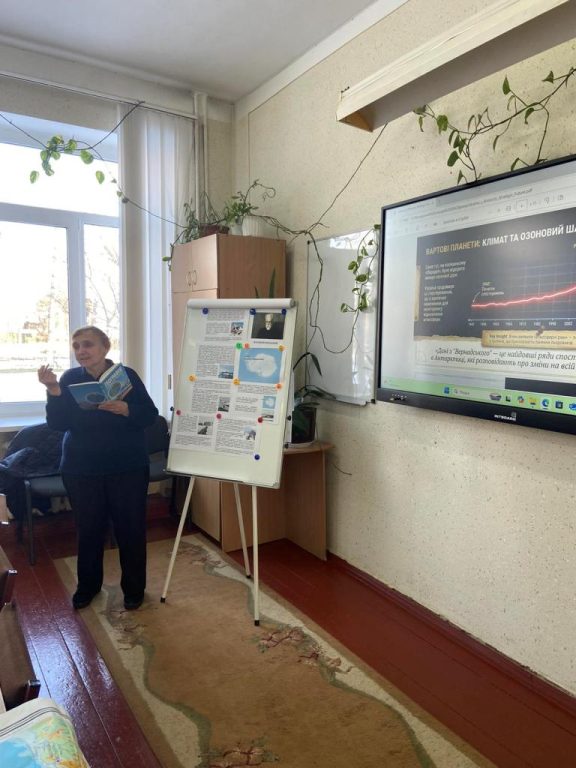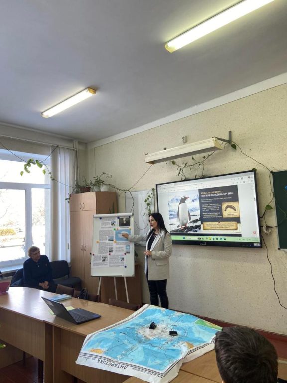 До проведення уроку долучилася шкільний бібліотекар Валентина ЛУНИК, яка підготувала тематичну виставку літератури та інформаційних матеріалів про історію освоєння Антарктиди, діяльність українських полярників, цікаві факти про крижаний континент і щоденне життя дослідників на станції.