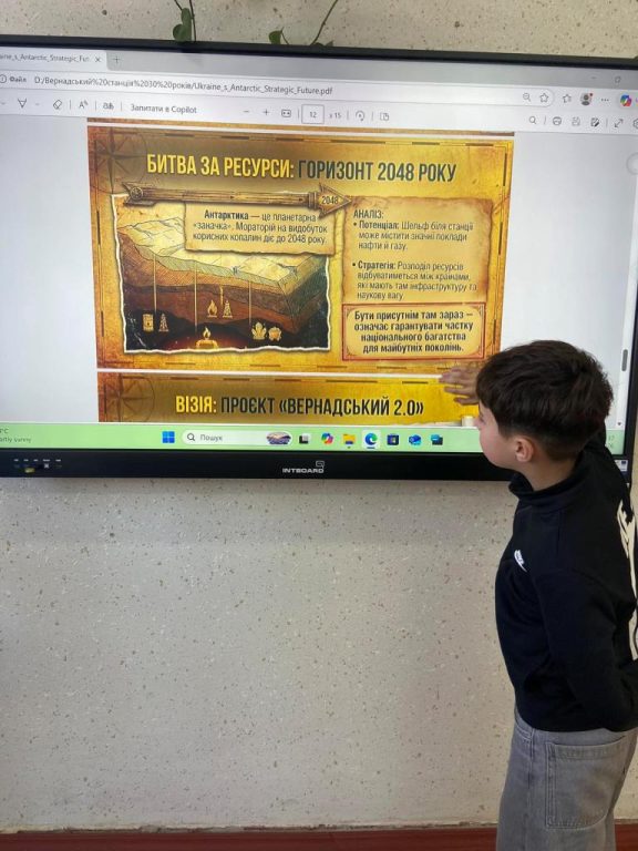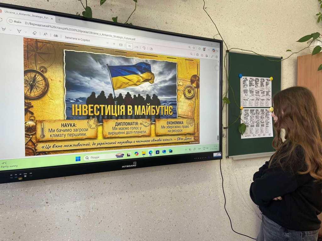 Під час заняття учні дізналися, що станція «Академік Вернадський» була передана Україні у 1996 році та з того часу стала потужним осередком наукових досліджень у сфері метеорології, геофізики, біології та вивчення кліматичних змін. Шестикласники із захопленням переглянули світлини та відео зі станції, обговорили особливості життя в умовах Антарктиди та значення міжнародної співпраці у науці.