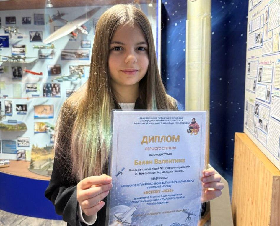 Лютий 2026 року приніс чергову перемогу Новоселицькому ліцею №1, на цей раз – зусиллями учениці 5-А класу Валентині БАЛАН, яка посіла І місце на Міжнародній освітньо-науковій Конференції-конкурсі «ВСЕСВІТ-2026» (керівники Олег ПЕТРОВ, вчитель фізики та Альона БАСАРАБА, вчитель біології), підсумки якої підведені 19 лютого 2026 року в Музеї авіації та космонавтики при Чернівецькому центрі юних техніків імені Леоніда Костянтиновича Каденюка.