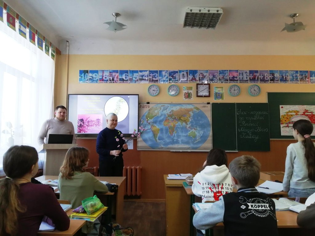 Під час уявної подорожі учні відкривали для себе Японію: країну давніх традицій, гармонії та дивовижної природи. Шестикласники пригадали географічне розташування країни в Азії, дізналися, що Японія розташована на островах і омивається водами Тихого океану. Для дітей були підготовлені цікаві географічні факти, які викликали жвавий інтерес. Також діти доповнювали розповідь повідомленнями, які підготували заздалегідь. Учні дізналися, що Японію називають «країною вранішнього сонця», що вона складається з тисяч островів, а одним із головних природних символів країни є велична гора Фудзі. Також ліцеїсти дізналися про один із найкрасивіших символів Японії – квітучу сакуру. Гілочка сакури стала символічною окрасою уроку, адже саме ця ніжна квітка уособлює красу, швидкоплинність життя та весну. Учні дізналися, що в Японії існує давня традиція милування цвітінням сакури — ханамі.