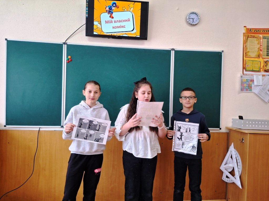 Під час заняття учні вчилися не лише аналізувати готові історії в картинках, а й розгадувати секрети їхньої побудови: від лаконічних діалогів у «мовленнєвих хмарках» до вміння передати динаміку сюжету через послідовність кадрів.