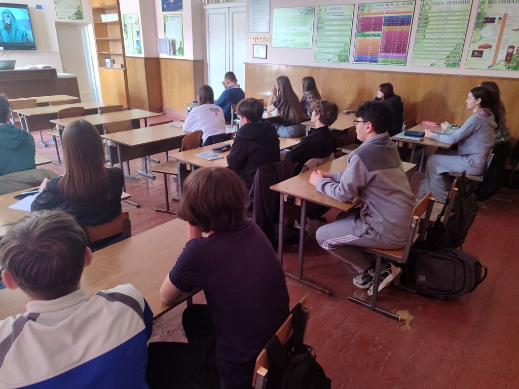 Враховуючи сучасні ризики, а особливо для України в часи війни, обговорили алгоритм дій в разі небезпеки ядерного ураження: переглянули відеоматеріал, із моделюванням дій протягом перших 24 годин після потенційного вибуху, спробували власноруч використати дозиметр для вимірювання радіації в навколишньому середовищі та застосувати протигаз, як засіб індивідуального захисту.